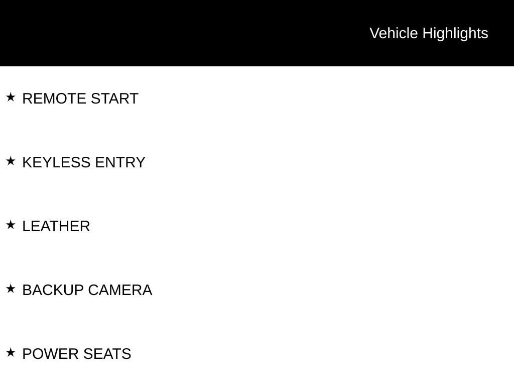 REMOTE START, KEYLESS ENTRY, LEATHER, BACKUP CAMERA, POWER SEATS.
