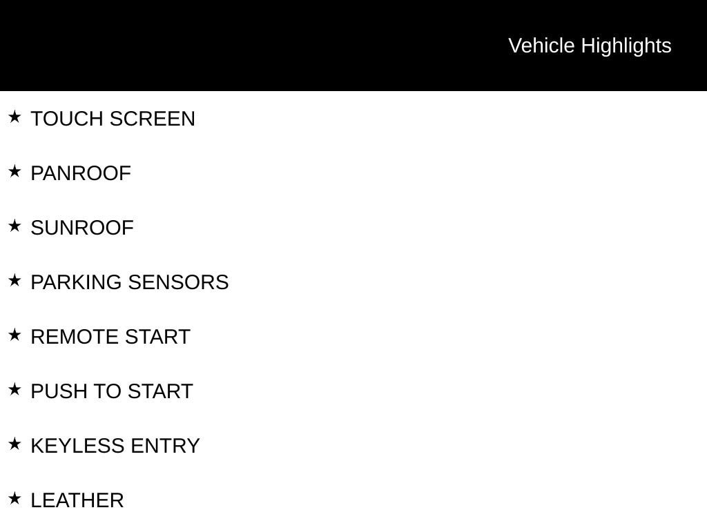 TOUCH SCREEN, PANROOF, SUNROOF, PARKING SENSORS, REMOTE START, PUSH TO START, KEYLESS ENTRY, LEATHER, BLIND SPOT ASSIST, REAR CROSS TRAFFIC, LANE TRACKING PACKAGE, APPLE CARPLAY, ANDROID AUTO, BACKUP CAMERA, POWER TAILGATE, POWER SEATS, DUAL ZONE CLIMATE CONTROL, AUTOMATIC CLIMATE CONTROL, SIRIUS SATELITE RADIO, AWD.