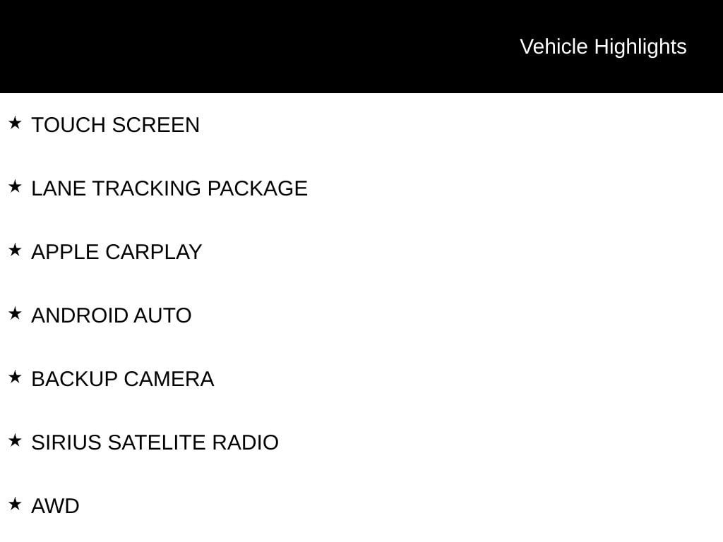TOUCH SCREEN, LANE TRACKING PACKAGE, APPLE CARPLAY, ANDROID AUTO, BACKUP CAMERA, SIRIUS SATELITE RADIO, AWD.